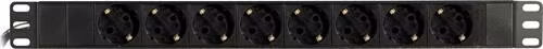 Kabelforgrener med 8xCEE 7/4 uttak, 1xCEE 7/7 tilkobling, uten bryter, 19" 1U, 3m kabel, pirkebeskyttet, svart