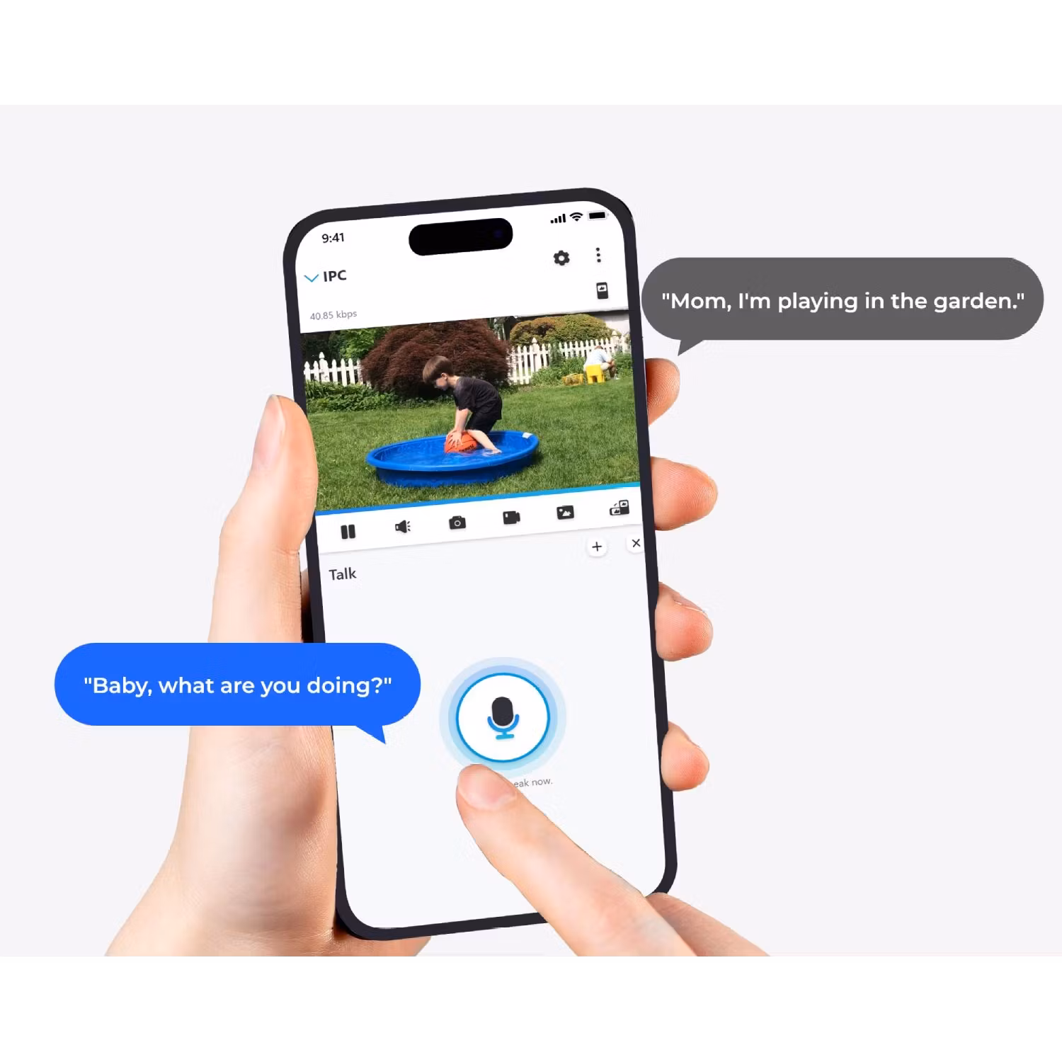 Takket være innebygget høyttaler og mikrofon kan du kommunisere via kameraet. Perfekt for å holde uvedkommende unna, eller gi en hyggelig velkomst til gjester osv.
