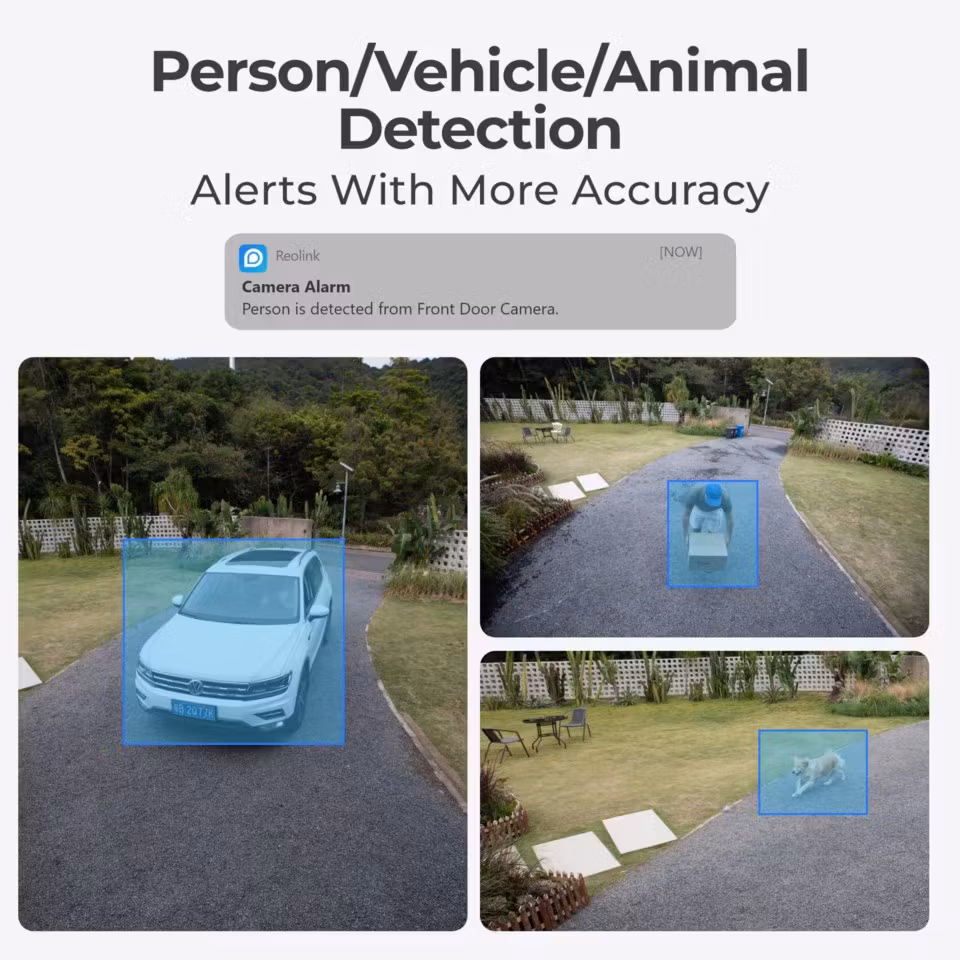 - Smart Alarm: PIR detection; motion detection; person detection; vehicle detection; animal detection