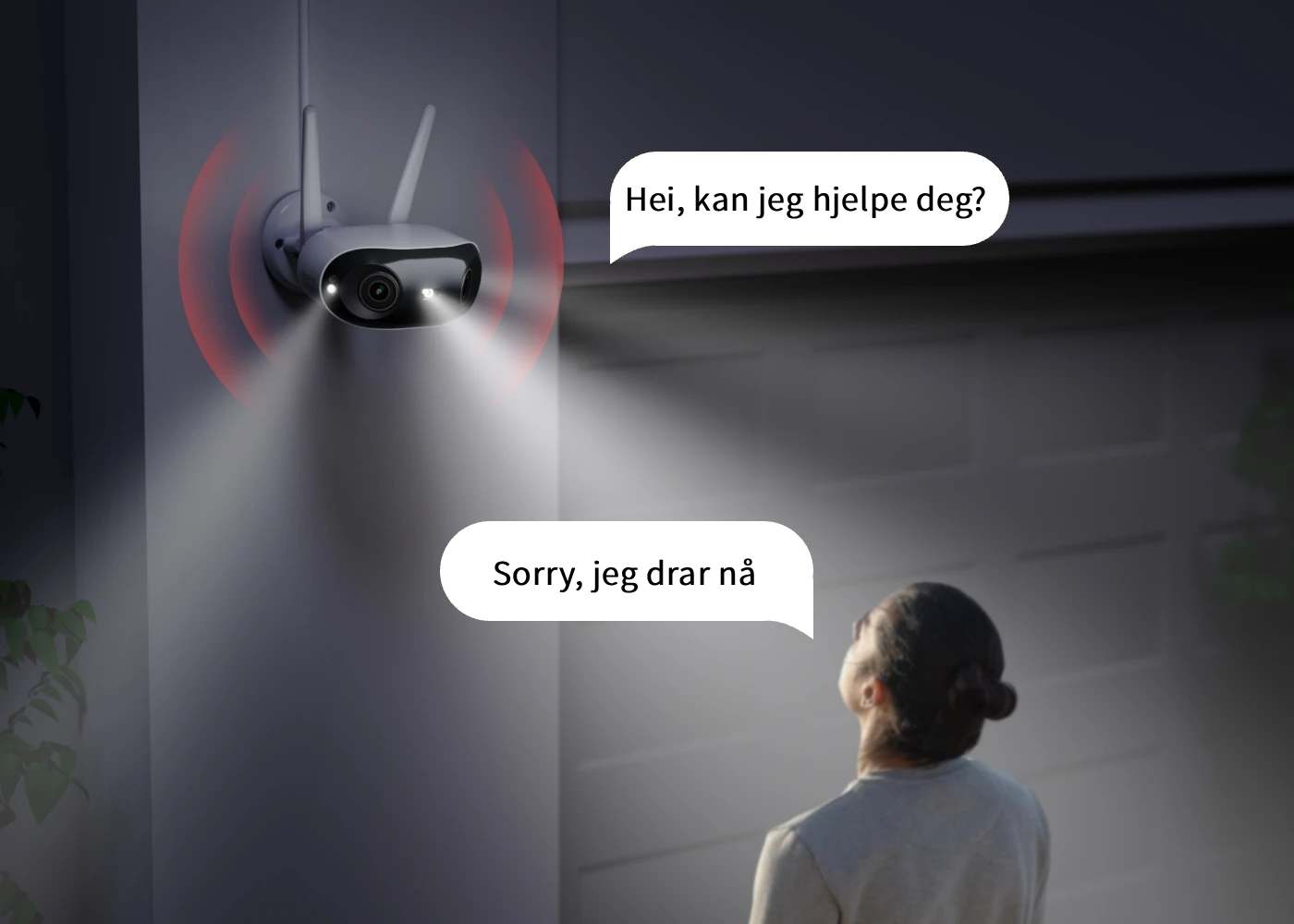 ![]() | Oppdager ikke bare – den handlerNår mistenkelig aktivitet oppdages, kan Spotlysene og den høye sirenen aktiveres for å skremme bort uvedkommende – samtidig som du får varsel i sanntid. Og skulle du trenge å gripe inn, lar den innebygde to-veis lyden deg snakke direkte med besøkende uansett hvor du er. |
