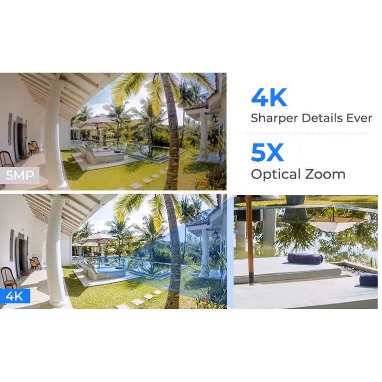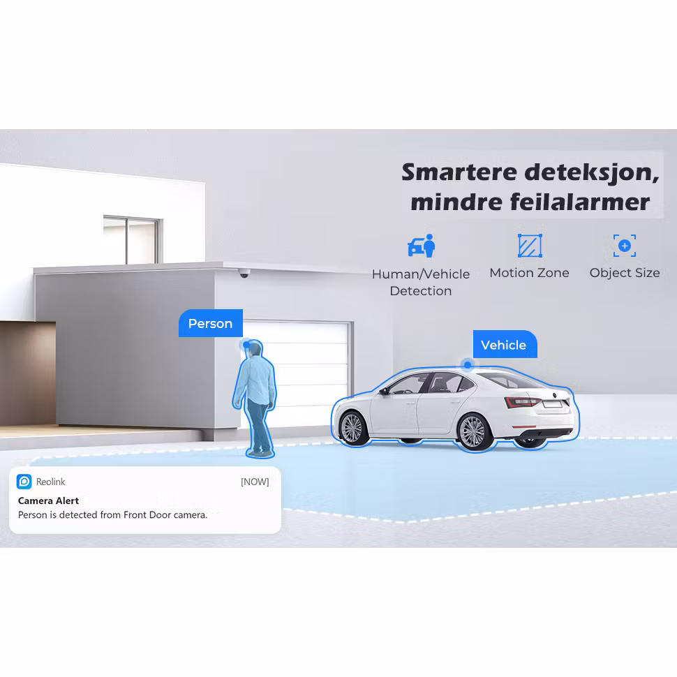 | Smartere deteksjon Med innebygget AI (kunstig intelligens) er dette kameraet smartere enn tradisjonell kameraovervåkning. La kameraet skille mellom mennesker og biler, og alt annet. | 4K og 5X optisk zoom Utstyrt med en 4K linse ser du krystallklar video – nesten som å være der selv. Og trenger du mer detaljer kan du enkelt flytte linsene 5 ganger nærmere objektet (zoom). |